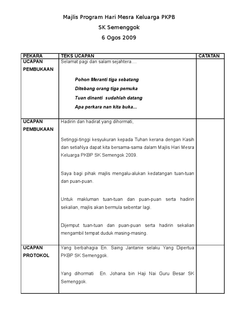Ahad 28 april 2013 teks pengacara majlis sambutan hari guru 2013 contoh teks ucapan pengacara majlis sempena sambutan hari guru smk demak baru 2013. Bunga cengkih di atas jerami. Majlis Hari Keluarga Pusat Pengajian Al-Syaafi 27 Nov 2016 PERKARA TEKS UCAPAN CATATAN UCAPAN PEMBUKAAN Selamat pagi.